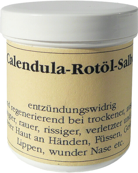 Die Calendula-Rotöl-Salbe nährt und pflegt Hände, Füsse, Lippen (Mundwinkel) oder auch eine wunde Nase. Sie ist hilfreich bei ausgelaugter, rauer, rissiger und geröteter Haut. Sie schützt vor Wind und Wetter, auch vor Sonne, weicht Hornhaut auf, wirkt entzündungswidrig bei kleinen Verletzungen, Hautentzündungen, trockenen Hautausschlägen, Hämorrhoiden, Sonnenbrand, Verbrennungen und Quetschungen.